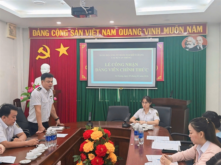Căn cứ Điều lệ Đảng cộng sản Việt Nam và các quy định của Trung ương về tổ chức Lễ công nhận chính thức cho đảng viên. Được sự đồng ý của BCH Đảng bộ Cảng vụ Hàng hải Kiên Giang, ngày 05/01/2025 tại Hội trường Cảng vụ Hàng hải Kiên Giang, Chi bộ Văn phòng đã tổ chức Lễ công đảng chính thức cho đảng viên Đặng Thị Thùy Trang.